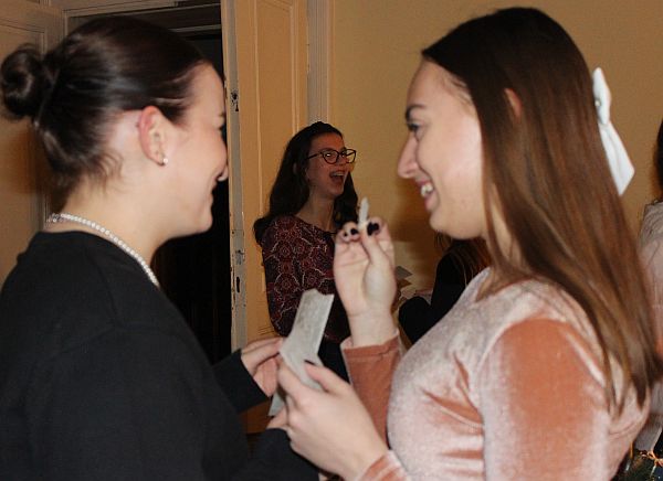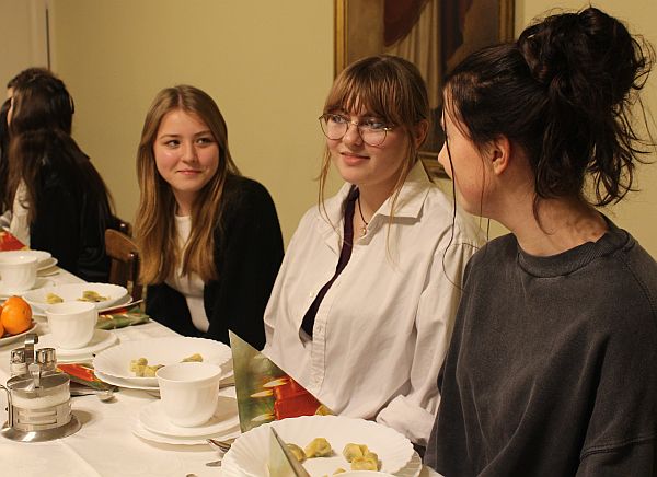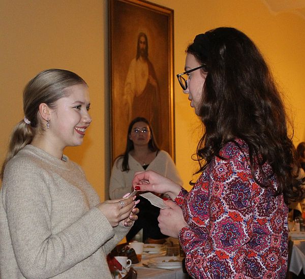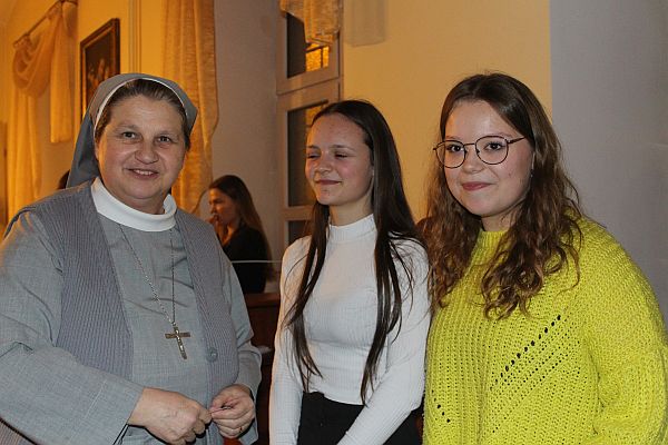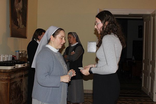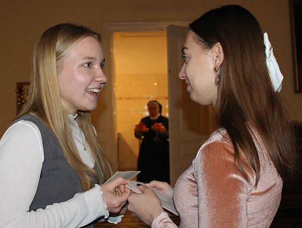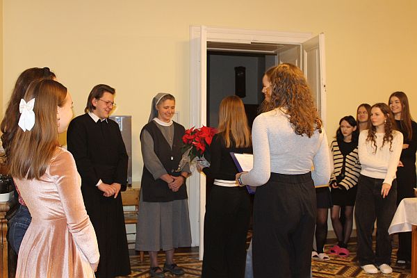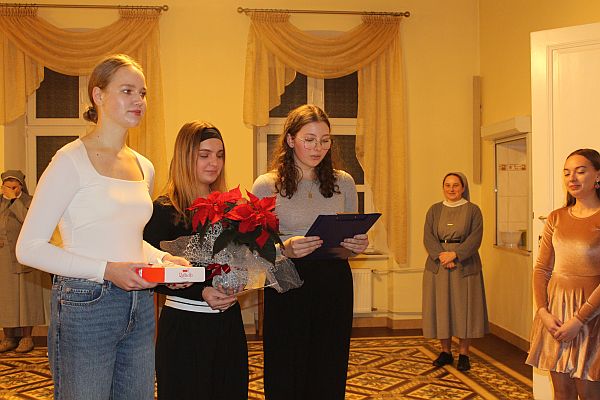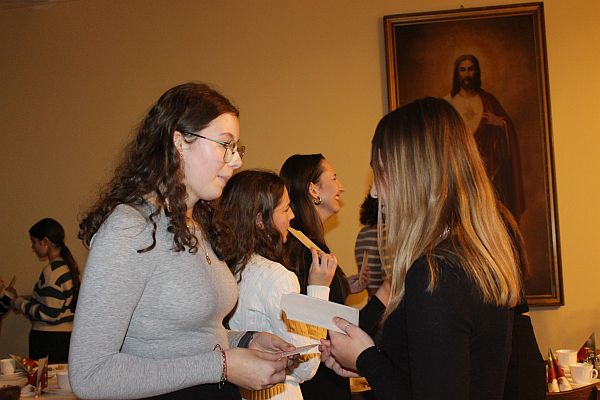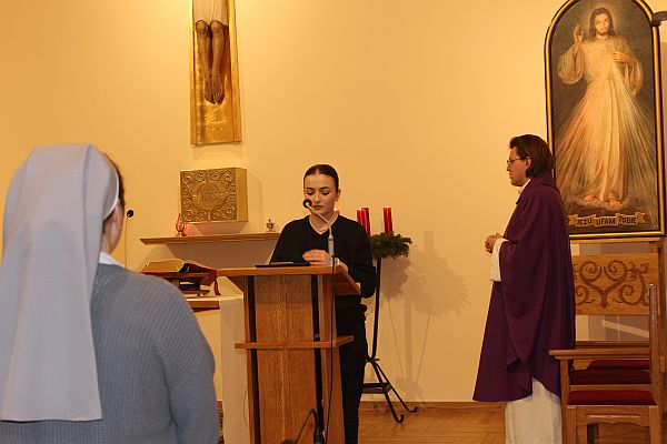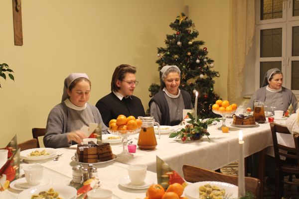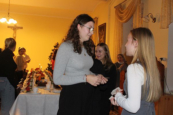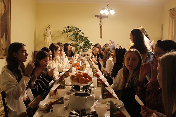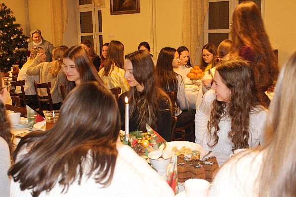 Po Mszy św. udaliśmy się do sali jadalnej, gdzie dekoracja i świątecznie nakryte stoły wprowadziły nas w bożonarodzeniowy nastrój. Wieczerzę wigilijną rozpoczęliśmy od przeczytania Ewangelii o narodzinach Pana Jezusa. W tym świątecznym nastroju Samorząd Bursy złożył życzenia Siostrze Dyrektor, Księdzu Partykowi i wychowawczyniom, następnie Siostra Dyrektor złożyła wszystkim życzenia. Po życzeniach nadszedł czas dzielenia się opłatkiem i powiedzenia sobie miłych słów. Był też moment wspólnego kolędowania przy dźwięku gitary. Święta już się zbliżają, otwierajmy nasze serca by Jezus mógł się w nich rodzić każdego dnia.